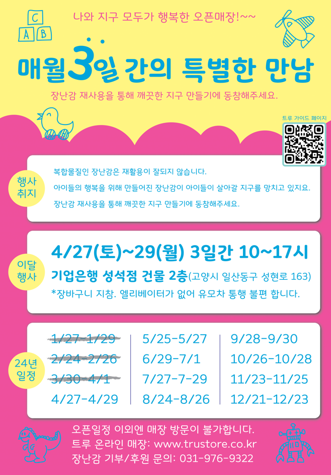 ํธ๋ฃจ ์ฅ๋๊ฐ ์ฌ์ฌ์ฉ ๋งค์ฅ์ ๋ฐฉ๋ฌธํ์ฌ ์ฅ๋๊ฐ์ ๊ธฐ๋ถํ ์ด๋ฆฐ์ด๋ค์๊ฒ '์ฅ๋๊ฐ ๊ธฐ๋ถ ๊ฐ์ฌ๋ฉ๋ฌ'์ ์์ฌํฉ๋๋ค. ๊ธฐ๋ถ ๋ฉ๋ฌ์ ๋ง๊ฐ์ง ์ฅ๋๊ฐ์ ํ๋ผ์คํฑ์ ์ ์ฌ์ดํดํ์ฌ ์ ์ํ์๊ณ , ์ฌ์ฉ๋ ์ฒด์ธ๊ณผ ํฌ์ฅ์ฌ ๋ํ ์ฌ์ฌ์ฉ์ ๋๋ค. ๋ณธ ๋ฉ๋ฌ์ ์ฐ์ ํ๊ฒฝ์ด๋ ๋์ฐธ์ ๋ํ ๊ฐ์ฌ์ ํํ์ด๊ณ ์ฆ์์์. ๊ทธ๋ฐ๋ฐ ํน์ ๋ชฐ๋ผ์, ๊ฐ์งํ๊ณ ์์ผ๋ฉด ํ๋ ํธ๋ฃจ์ ๋ฐฉ๋ฌธํด ์ธ ์ผ์ด ์์์ง๋์!